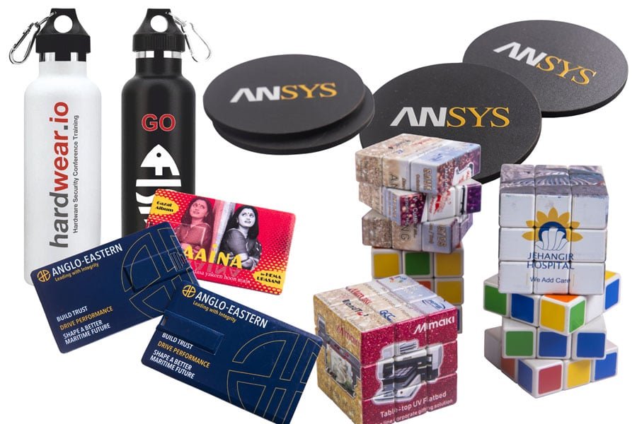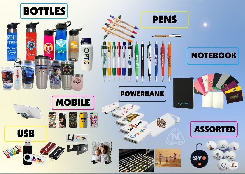 - Promotional products: Pens, USB drives, notebooks, mugs, etc.